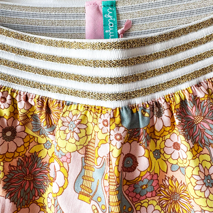 Poseban akcenat je zlatno-beli prugasti lastiš oko struka, diskretan, ali efektan detalj koji unosi svetlost i suptilan sjaj, a istovremeno pruža udobnost i prilagodljivost.