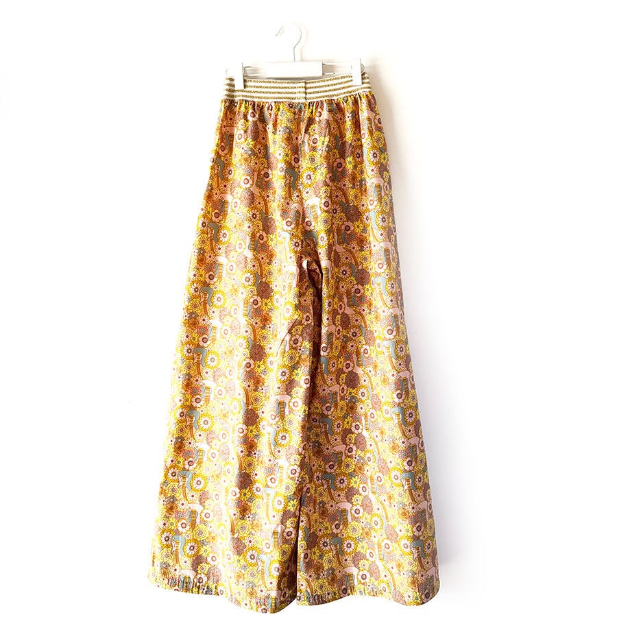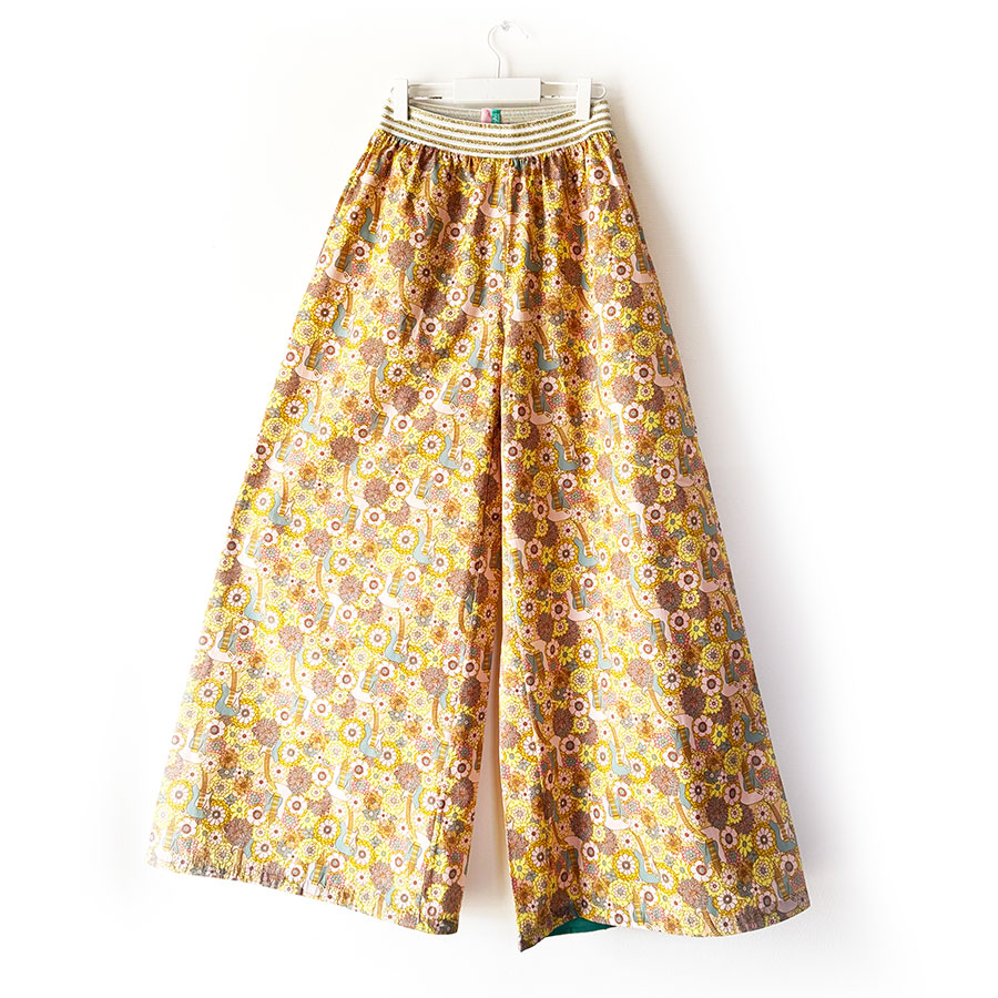 Kroj je širok, lepršav i udoban, forma koja u pokretu podseća na suknju, a zadržava praktičnost pantalona. Dugačke, raskošne nogavice stvaraju ritam pri hodu i daju silueti lakoću.